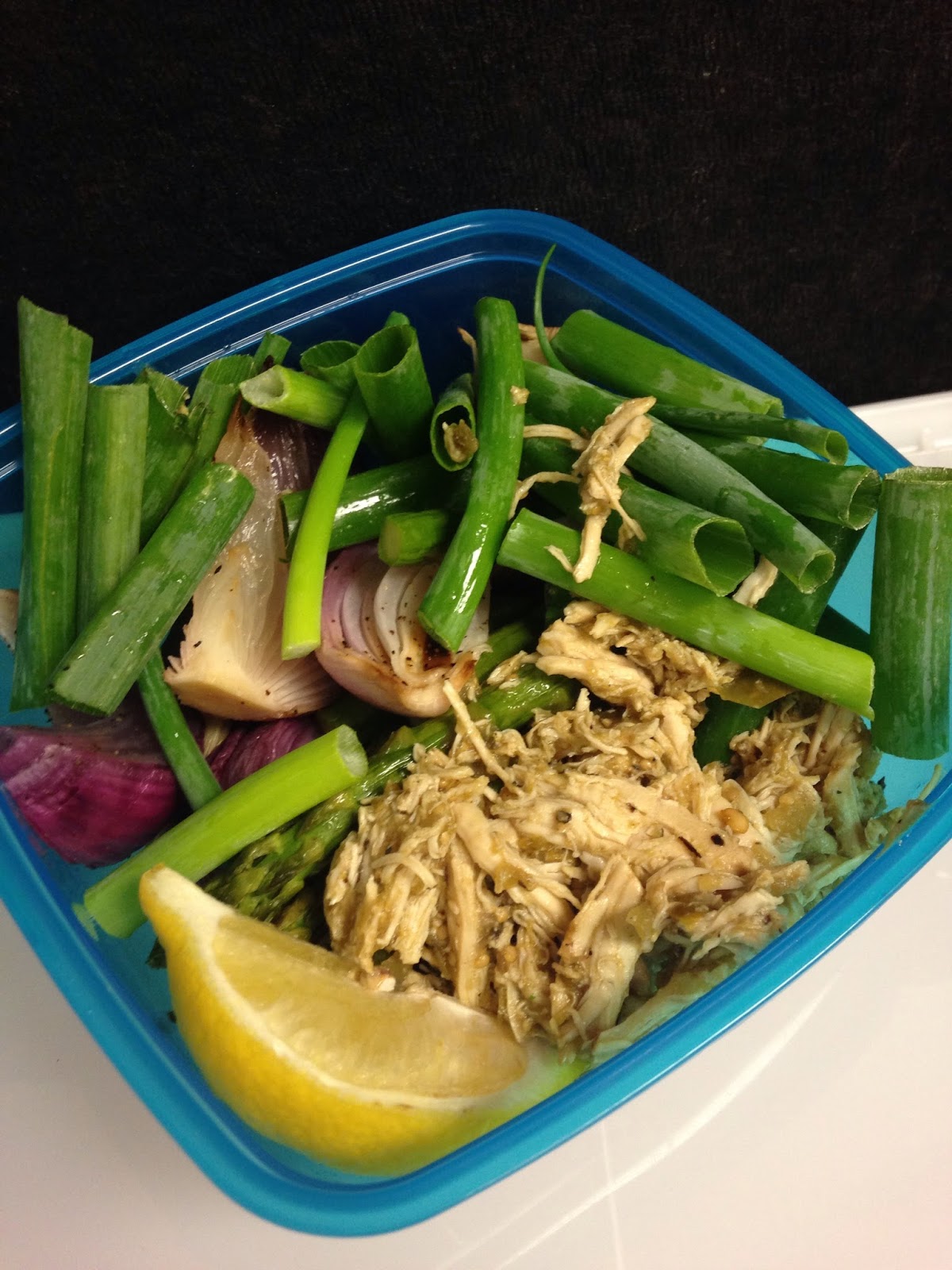 Lunch was a tad heavy on the onions. The roasted red onions were soft and sweet, but the raw scallions had quite a bite to them. Sympathies to anyone who needed to talk to me the rest of the afternoon; my breath was fierce! This is my first experience with fennel. It definitely has that licorice taste people talk about. I would give it another go but probably if it was cut into smaller pieces and incorporated with other ingredients more. This lunch was more of pieces of food together in a bowl that you eat separately. The chicken and asparagus were my favorite parts. I picked at this bowl over the course of a few hours. No one should eat that much potent flavored foods in a rush!